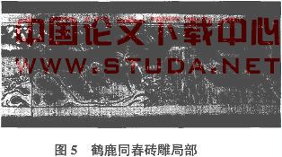 意境是艺术之至妙,要达到统一的意境,必须做到“天人合一”和“物我相融”、“寓景于情”,让环境的表现力达到出神人化的境地 ,使人“登山则情满于山观海则意溢于海”。从“崇山峻岭,茂林修竹,又有清流激湍,映带左右”的环境中得到游目骋怀、怡然自足的雅兴。天津砖雕艺术注重对空间环境的渲染 ,达到掩映藏露,无画处皆成妙境的效果。对配景的刻画,亦考虑彼此关系上的照应,以形成统一的气韵。例如,图 5中的“鹤鹿同春”,其将动物与山水、建筑、植物进行有机组合,让整体构图穿插有序。鹤、鹿作为画面主体被放在主要位置,并用山水、建筑、植物将整体画面联系起来。画面比例适中,动静相生,其中水纹虽然是砖雕中的配景 ,但其所刻景物散淡飘逸 ,令人 回味,见图 5。