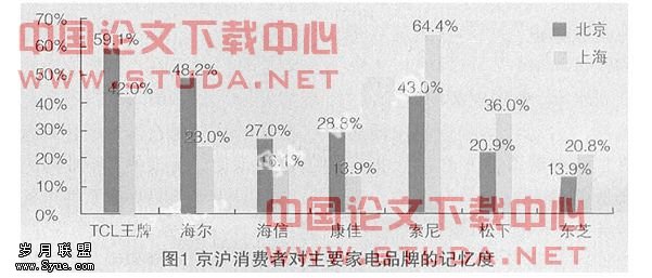 同时由于中国地域广大,亚文化圈数量众多,不同地域由于环境和社会环境等因素的制约和影响,形成了不同的区域消费文化特征。生活在一个国际大都市,上海人和北京人在追求档次、品位方面虽有共同点,但也存在明显的不同。和北京人相比,上海人更追求西化,体现在品牌选择上,就是更愿意接受进口品牌。零点调查关于消费倾向的研究中,有54%的上海人声称自己“偏爱进口东西”,而北京人中这一比例仅为42%:在2002年零点调查家电消费研究中,上海人对外资家电品牌(如索尼松下等)的记忆度高出北京10个百分点以上(见图1)。