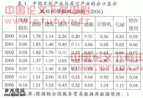 显性竞争优势(RCA)指数的也表明,我国文化产业本身不具备较强的竞争力,而相对与我国其它一些服务产业的贸易出口,竞争力也显得较弱。从各服务行业的情况看,我国文化行业同通讯、保险、、特许使用行业一样,都属于我国国际竞争力比较优势最弱的行业,其产业竞争力远小于建筑、、其他商务服务、运输、计算机等服务产业。与用TC指数分析的结果一样,尽管我国文化娱乐产业整体上还没有呈现出较强竞争力,但近年来其出口能力的快速提升值得关注。2006年我国文化产业RCA指数是2000年的400%,出口的提升远大于其它服务行业,体现出了我国文化服务出口的巨大潜力。
