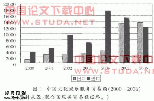 近年来,我国文化服务贸易出口总体上保持了较快的增长势头。在2000至2006年间,连续六年保持增长,年均出口增长率达到51.65%,2006年出口额达到1.37亿美元,而同期文化服务贸易进口额仅保持21.68%的进口增长率,近年还出现了进口的负增长,2006年进口额为1.21亿美元。