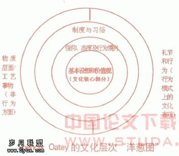 文化有许多定义,著名的管者爱德华·霍尔、吉尔特·郝夫斯泰德等都对文化下过定义,并认为文化的层次关系就像是洋葱一样由多层次组成,每一层都影响着更高层次。斯宾塞(Spencer Oatey)认为“文化是一个民族的人民所共有的一系列模糊的态度、信仰、行为习惯、基本设想和价值观, 而这些态度、信仰、行为习惯、基本设想和价值观会影响每个成员的行为和每个成员对其他成员行为的解释”。他对文化层次的横向剖面分析如图一。