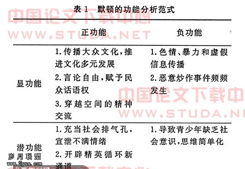 马林诺夫斯基在《文化论》一书中认为:文化是用来满足生活需要的,所以说文化是有功能的。功能就是满足生产力需要的能力。他提出功能派之初着重在从基本上说明文化是人们为了满足人的需要而发生的,文化对人是有用的,功能等于用处,所以他说要了解文化的意义就是要明白它对人的用?处。 [3]因此,要分析博客这一文化现象,要从它对人们的社会生活所起的功能去分析。马林诺夫斯基所著的《文化论》是早期功能主义人类学的最高成就的代表,从博客的功能这一角度去对其进行分析更符合《文化论》一书的思维体系与方式。默顿的功能分析范式对后期功能主义的发展有着深远的影响(见表1)。本文采用默顿的功能分析范式,对博客这一文化现象进行分析。