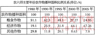 从资料可看出,农六师种植业结构趋向合理化,粮食作物比重在不断下降,作物的比重不断上升,形成以经济作物占主导的趋势。但从内部结构看,粮食作物以2005年资料为例,小麦和玉米占92.5%;经济作物中棉花占77.45%。说明农六师种植业内部结构不尽合理,粮食和经济作物的品种单一。