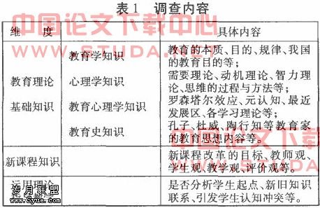教育理论基础知识是一个教师必备的专业基础知识,也是教师形成良好教育理论素养的必备前提,本调查编制了17个题目,从教育学、心、教育心理学、教育史等几个方面人手,对中小学教师的教育理论基础知识现状进行了测查。新课程改革为基础教育注人了新的活力,也对教师的理论素养提出了新的要求新课程知识是新时期教师教育理论素养的重要组成部分。本调查编制了10个题目,从新课程改革的目标倡导的教师观、学生观、教学观、评价观等方面了解教师对新课程的理解程度,运用教育理论指导教学行为是教师教育理论素养最直接的体现。本调查编制了5个题目,对教师在实际教学中运用教育教学理论指导自身教育教学行为的意识和能力进行调查。