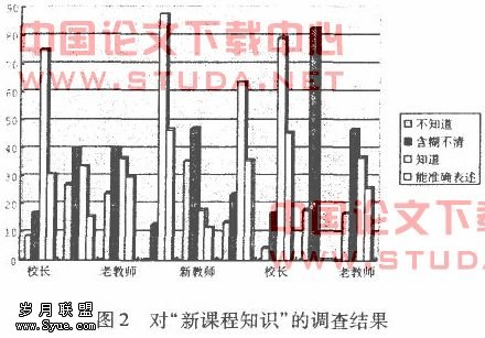 对新课程倡导的新理念,校长中有8.4%的人不知道,16.7%的人含糊不清,新教师中26.7%的人不知道,40%的人含糊不清,老教师中26.7%的人不知道,40%的人含糊不清。