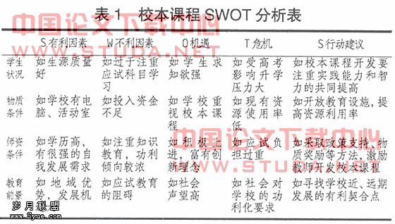 现状分析的目的是要弄清学校方向、特点,具备的条件和限制,如学生的需求和发展目标,教师的数量、知识经验和能力,学校所能提供的材料和设备及其相应的资金情况,课程计划的弹性空间,学校的发展规划、特点,学生的素质和已有经验等。学校现状分析是十分复杂的工作,我们可以采用SWOT分析法来进行。运用这种方法,可以使我们系统认识学校课程开发的内外部条件,便于把握机遇,发挥学校优势,避免障碍,从而制订的课程开发计划、方案及对策。在此,我们提供依据SWOT方法的校本课程现状分析框架(见表1)。