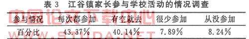 1.2.3 家庭、家长较为被动:家长由于自身的意识、素养,难得主动,再加上目前的教育体制,在家校合作中成为较为被动的一方。没有主动性,积极性便无从谈起。根据调查,对学校活动很重视,基本每次都抽时间参加的家长不超过半数,只占43.37%;大部分家长对学校活动并不积极(见表3)。家长在家校合作中的主动性低下,这其中不仅受农村社会生活实际、家长自身素养等原因的影响,学校一手包办对学生的教育也为家长主动性的低下找到了借口。