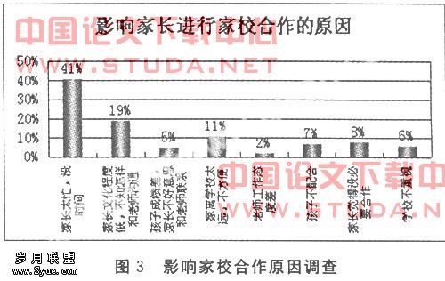 2.1 农村生活环境不佳:中国农村生活环境仍然处于贫困和落后阶段,生产与的长期滞后影响着家校合作教育。虽然近年国家减免了农业税,并且对农村基础教育实行“两免一补”,但是现在农村经济的主体依然是传统的小农经济,效益差;对于外出务工人员,由于受自身素质约束,也只能从事简单的体力劳动,而这需要投入大量的时间。这与我们的调查结果是一致的:太忙成为家长不能参与家校合作教育的首位因素,占41%(见图3)。
