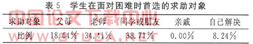 江谷镇家校合作的形式不仅单一,而且“以一对多”。一名教师需要同时面对数十名学生及其家长,由此造成每当学生遇到困难时,本应作为首选求助对象的教师往往发挥不出其应有的作用。根据调查,遇到困难时首选向同学、朋友求助的学生占38.71%,居第一位;而首选向教师求助的只有34.41%,位居第二(见表5 )。由此可知,“以一对多”的大班教学不仅给老师带来了沉重的工作压力,而且也影响了家庭与学校的合作关系,减弱了教师、学校在家校合作教育中的指导作用。