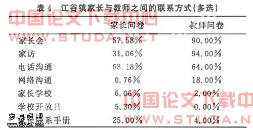 江谷镇家校合作的形式单一。不论是教师问卷还是学生家长问卷,位居前三位的家校合作的形式选项都是传统的家长会、家访、电话这“三板斧”(见表4)。
