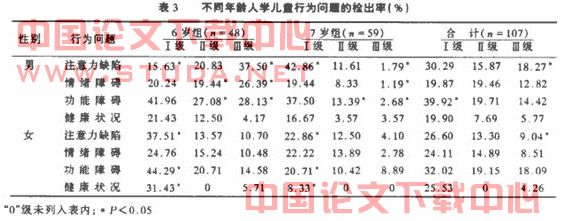 2.3不同入学年龄儿童行为问题分析(见表3):107名儿童中男童4项行为问题检出率均不同程度地高于女童,其中尤以严重注意力缺陷检出率显著高于女童。6岁男童行为问题检出率显著高于7岁儿童(n、班度);6岁女童4项行为问题检出率亦不同程度地高于7岁儿童,然而只有I度检出率两组有显著性差异。