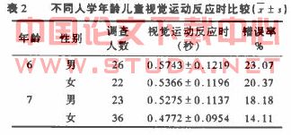 2.2不同人学年龄儿童视觉运动反应时比较(见表2):6岁组男女儿童视觉运动反应时均较7岁组男女儿童略延长,错误率亦较7岁组男女儿童高,但两组儿童无显著性差异.未发现学习疲劳对6岁和7岁儿童条件反射的影响。这可能与他们神经活动以兴奋过程占优势有关。