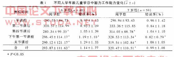 2.1不同年龄入学儿童的作业能力分析(见表1):107名一年级学生学日中作业能力变化符合脑力工作能力变化一般规律。即早读前阅字数并不高,学习开始后逐渐上升,第二节课后达高峰,第四节课后下降,经午间休息后,阅字数又回升,末节课后又下降。6岁组平均阅字数显著低于7岁组。第四节课后的3次测试,阅字数均值都显著低于7岁组,午后第一节课后的错误率也显著高于7岁组。由此可见,6岁儿童脑力工作能力水平低于7岁儿童。