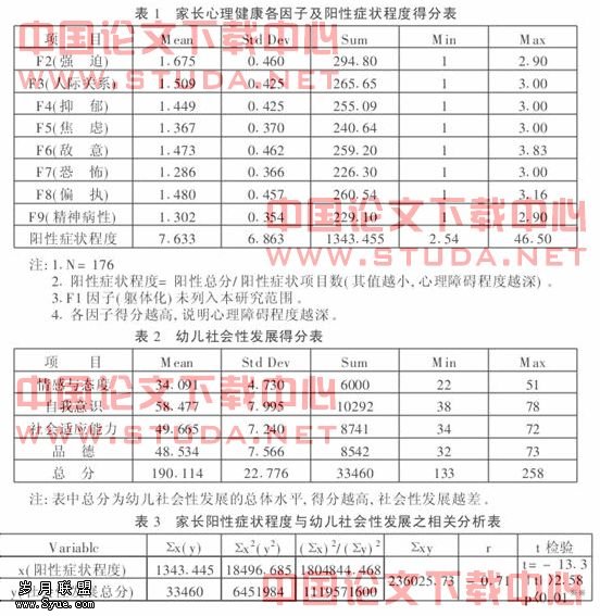 本研究主要采用问卷调查法。每套问卷共有两种。一种为《SCL—90症状自评量表》,本表含有9个症状群共有90道题,由幼儿家长根据自觉症状填写,参照常模测出家长的心理健康水平。另一种为《幼儿社会性发展的调查表》(根据《幼儿社会性发展评价》一书制订)主要从幼儿的情感态度、自我意识、社会适应能力及品德等四个方面的发展来评价幼儿社会性的发展。幼儿问卷主要由家长根据幼儿日常生活中的实际表现填写,其中部分内容是由教师填写及调查者对幼儿回答的笔录。幼儿问卷的每道题的答案分“很少”“有时”“经常”三级,分别记1—3分。我们对正向和反向问题进行了统一的编排,A、B、C为相应等级,分别赋予1、2、3分。每题得分之和便为幼儿社会性发展总体水平。总分越高,显示幼儿社会性发展越差。问卷发放前对有关人员进行了培训。
