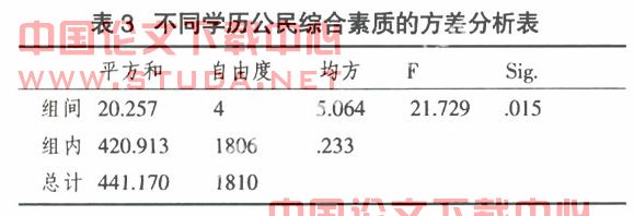 为了从总体上检验不同学历公民素质的差异。我们使用单因素方差分析,其结果见表3。