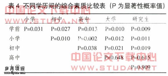 表3表明,各个层次学历之间的综合素质得分均值之间存在显著差异(F=21.729,P=0.015)。