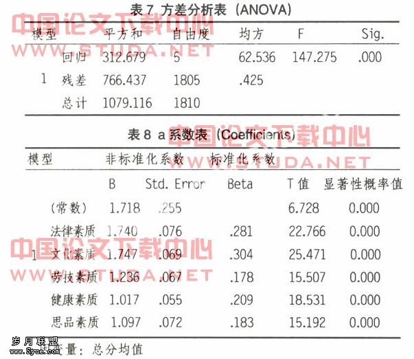 首先对回归方程的有效性进行了检验,由表7得知F=147.275,P=0.000<0.05,所以该回归方程有意义。随后得出回归方程为:y=1.740x1+1.747x2+1 236x3+1.017x4+1.097x5+1.718(系数的大小表明对总分影响程度的大小)。其中,总分为v,素质为x1,文化素质为x2,劳技素质x3,健康素质为x4,思品素质为x5,可见,对综合素质影响比较大的是法律素质、文化素质两项,比较低的是健康素质、思品素质两项。