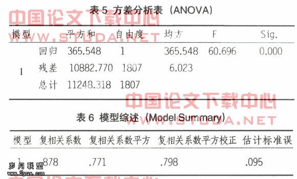 为了验证该方程式是否具备统计意义,我们对该等式进行了回归模型的有效性检验。表5、表6为方差分析与模型综述结果。 我们知道,当回归系数显著性概率值小于0.05时。回归式具有统计意义。在本次检验中,表5中的F=60.696.P=0.000<0.05,所以该回归方程有意义。