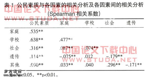 根据调查数据,对公民素质与影响公民素质形成的各项因素进行相关分析,结果见表1。