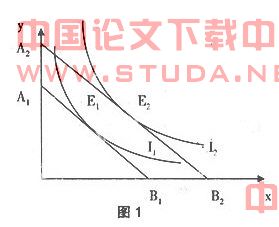 按照序数效用论中消费可能线和收入—消费曲线对消费者均衡的理论分析,图1中有两条无差异曲线I1和I2,每条线表示购买两种商品的所有组合给个人带来的满足程度是相同的。如图1: 其中,X轴线表示个人生活开支,而Y轴线表示个人对生活条件的偏好,社会的尊重,自我价值的实现等等(假设这些是可以用货币衡量)。对于中小学教师而言,其初始的消费可能线,即预算线为A1B1,表示教师收入的约束线。在E1点达到效用的最大化。而教师作为理性人,不会仅仅满足于当前的效用最大化,而是会继续追求个人效用偏好最大化的E2点。而E2点表示在教师收入和商品价格既定条件下,教师能够购买到的多种商品数量更大的组合,预算线则是教师购买选择所受固定收入的客观限制,也即教师消费行为的限制条件。如图所示,预算线A1B1和A2B2相比,A2B2是收入较高的线,而无差异曲线I1和I2相比,I2是效用较高的曲线。当A2B2与I2相切于E2时达到效用最大化,从以上分析我们可以看出,教师作为以理性经济人,他们会作出同样的选择,即在成本一定的情况下,追求受益最大化。