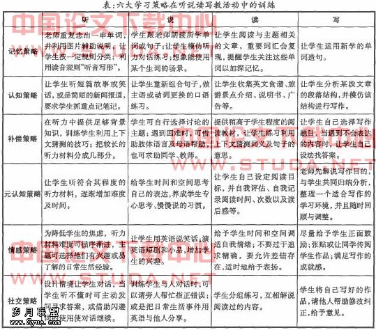 直接进行策略训练常用的方法包括:讲座与讨论、讲习班、将策略编人教科书中、基于策略的英语教学,也可以将策略训练融人课堂教学中去。不少研究发现,策略训练能弥补学生因认知能力的不足而造成对学习的不利影响,当学生再次遇到类似学习任务时,就知道如何应用,也能获得较佳的学习效果。因此专家建议,学习策略的教学应采取直接教授为佳。要在课堂上渗透英语学习策略,教师可以采用隐藏式训练方式,即通过设计好的材料和活动训练学生使用某策略。例如,通过完成课本中的练习,学生在学习中自行确定、模仿和自我评估诸如自我监控、记}乙、合作等各种学习策略。这样,策略训练就与常规课堂教学有机地结合在—起。教师也可以在学习过程中对某一策略进行详细解说,让学生辨析策略的使用,并示范如何将该策略应用于不同的学习情境,同时系统地给学生提供练习和自我评估的机会,让他们能将所接收到的知识加以组合与理解。下表以Ofxord归纳的六种学习策略为例,举例说明了这些策略在英语的听、说、读、写各项教学活动中可进行的训练方式。当然,根据学生所处的不同学习阶段和各自特点,教师可有选择地进行策略训练。 随着学习策略训练时间的增加,学生的策略意识逐渐提高,就会出成功组织和进行自主学习的技巧 “。他们对学习策略越熟练,就越能将学习策略加以迁移到新的学习情境。这样,教师在学生学习过程中所扮演的角色会逐渐减轻,而学生的学习责任则会日渐加重,符合现今“以学习者为中心”的潮流。