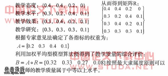 运算:首先用权重模糊矩阵与因素(指标) 模糊矩阵相乘,再把它们的乘积与等级矩阵的转置矩阵相乘,其积就是最终评判结果。需要指出的是,以上所述是一级综合评判的方法和步骤。在本文的研究中是多级综合评判(三级),必须逐级进行,即根据三级指标来评判二级指标,根据二级指标来评判一级指标,最终对教学质量做出评价。 4. 应用实例