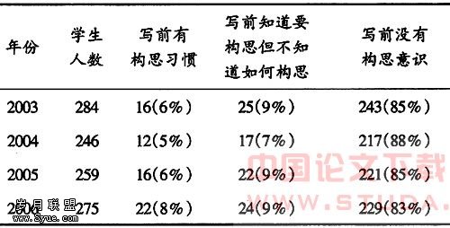 构思虽然是写作过程不可缺少的环节,然而在英语议论文写作教学中常常被很多学生忽视。笔者从事普通高师英语专业写作课程教学4年来,发现学生在课堂限时议论文写作时往往没有经过构思就进行写作。笔者曾经对所教“大二”学生进行了一项议论文写作构思情况的追踪调查: