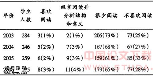 图式理论认为,作者在写作过程中只有激活已有的知识结构才能写出文章。有学者把写作过程划分为积累、构思、表达的过程论和强调写作过程的构思论。该理论强调积累在写作过程中的重要性,这也符合语言学家Krashen“大量的输入”和“可理解性的输入”以及行为主义心家关于“刺激-反应-强化”对语言表达的促进作用等理论论述。Krashen的输入假设“i+1”也解读了作者在写作过程中的积累与创新的关系。因此,写作者平时阅读并分析大量的议论文对日后无论是限时作文练习还是TEM4和TEM8考试以及今后的毕业论文写作均大有益处。然而,笔者对学生平时阅读英语议论文的情况调查结果却令人大失所望。