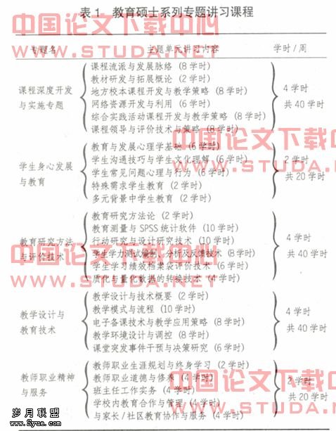 为了对教育硕士课程中存在的问题进行系统而持久的改革,s大学建立专门的教育硕士课程改革专家小组,并针对“教育硕士培养课程新方案(初稿)”进行了4轮小组集中研讨和研讨后分工修改,最后确定了S大学教育硕士培养课程新方案及实施措施。这些课程目标旨在使教育硕士在专业实践中体现优良绩效教师的专业行为,从而发挥实践领袖作用。S大学教育硕士课程新方案由“系列专题讲习”“专攻领域工作坊研习”“教育现场实习”三大块构成,其中“工作坊研习”是以往教育硕士课程体系中缺少的,而在新课程体系中起核心纽带作用。学员带着工作坊研习的任务或问题,走进每个专题的各个主题的讲习中,回到教育现场的实践中。这样通过类似“任务学习”的方式不仅实现了理论与实践的结合,而且学时与质量有了统一的要求与保障,同时时间安排与研习形式也更加灵活,给学员以充分自由的选择空间。