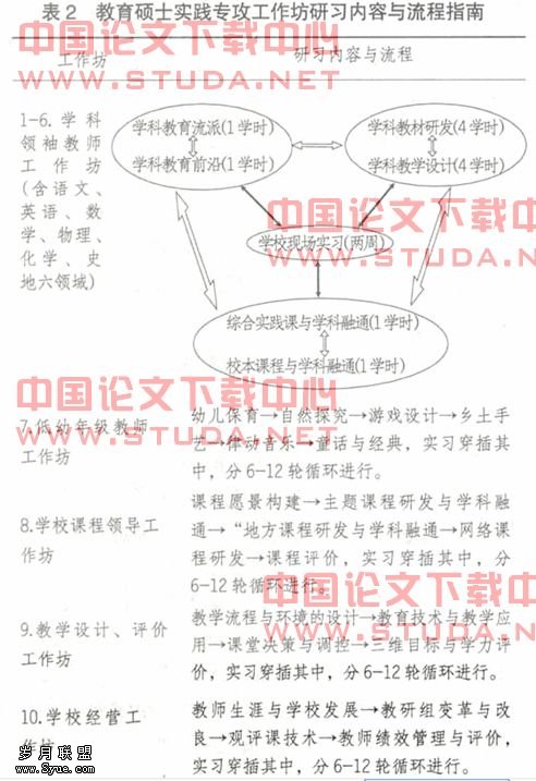 (二)专攻领域工作坊研习前期准备阶段 学员入校后第一个月属于调试定位期,主要通过集中专题讲习激活学员的思路,从而引导学员根据自己的兴趣、专长及单位实际,并结合s大学教育硕士课程安排,选择导师及实践专攻方向,最后递交自己专供领域的“研习计划”与“实践改良方案”初稿。“研习计划”是向培养单位递交专业发展目标与方案,主要包括:对自己在实践专攻领域的优势与不足有具体深入分析;希望通过什么方式提升自己的哪些专业特征;大学研习与单位实习的时间分割及具体安排。“实践改良方案”针对的是如何发挥实践专攻领域领袖作用帮助其他教师发展,相当于向工作单位递交的工作计划,主要包括:对所在单位及其教师在这一实践领域的实际情况有全面而具体的描述;改善所在单位存在的不足,提升其教师胜任力水平的操作方案;对可能遇到的困难的预计与解决方案。如此一来,脱产学习与学校工作得到了有机结合,既利于教育硕士课程回归实践,又易于得到工作单位的支持。
