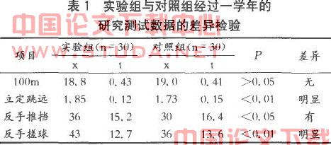 2.2.1实验法:随机分组,将04级乒乓球选项班的60名学生随机分成两组,每组30人,随机将一组指定为实验组,另一组为对照组。对实验组学生学习评价采用过程性评价:即在上乒乓球课时,结合所授教学内容(如.反手推挡、正手攻球、搓球等专项技术和身体素质的锻炼等),采用8~10课时进行一次测验或观察分析,再将结果与评价反馈给学生,让她们及时了解自身学习情况,在一学年的时间里共进行了8次评价。对照组的学生学习评价采用传统的终结性评价:即在每学期体育课结束时进行的评价,一学年共2次。在学年结束时两组进行lOOm、立定跳远、反手推挡、反手搓球或正手攻球技术的测试,纪录其测试数据。