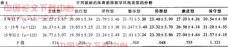 4.1从总体上看,教师教学风格类型的以激进型、立法型、局部型、整体型四种教学风格为主。关于教师教学风格的研究,有关学者研究结果表明:教师的教学风格类型以激进型、立法型、评判型、整体型四种教学风格为主,这四种教学风格是相对复杂、有创造性和效率高的教学风格,Grigeorenko&Stem berg的研究结果发现老教师相对于新教师教学风格类型更倾向于执行型、局部型和保守型。有关学者对高效能教师与一般教师的教学风格进行研究,结果发现一般教师相对与高效能教师更加倾向与执行型和保守型的教学风格,这从另一侧面验证了前面提及的研究结论,即执行型、保守型教学风格是相对简单、效率低和不受欢迎的教学风格。本研究的一部分结果与其相一致。由于体育专业的特殊性和近几年来我国素质的推进,促进体育教师教学风格的不断完善。