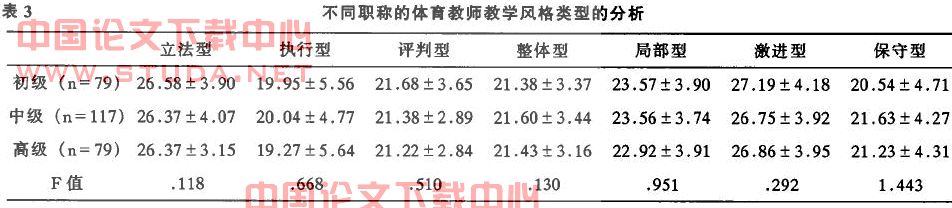 表3显示:不同职称的体育教师教学风格类型没有显著的差异,但初级职称的体育教师教学风格在立法型、评判型、局部型和激进型四种风格上的得分高于中级和高级职称的教师;中级职称的教师教学风格类型在执行型、整体型和保守型三种风格上的得分高于初级和高级职称的教师;而高级职称的教师教学风格类型在执行型、评判型和局部型三种类型上得分最低。如表3。