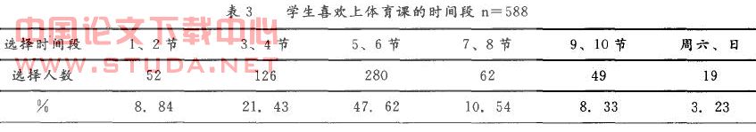 主要采取教务处统一安排各系、各专业每个学期上课的科目、教学时数、教学时间,学生选课的方式。体育课大都安排在上午3、4节和下午5、6节,个别安排在7、8节,其他时间没有体育课。经过调查发现,各个专业在学校安排该专业上体育课的时间并不是唯一的,同时还有几个时间段是空闲的,可以用来上体育课(见表3)。