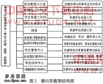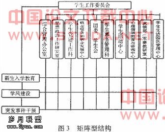 是在原有的学生管理的直线型层级结构、横向职能型结构的基础上,再建立一个横向的系统,两者结合成为矩阵型管理模式。(见图)3其特点是加强了部门之间、组织之间的协作,把垂直领导和水平联系较好地结合起来,是既讲分工又讲协作的一种组织结构模式;矩阵型结构模式以解决问题为目标,以任务、工作为中心,组织间信息交流以横向为主、纵向为辅。例如,为加强学风建设,组成由学校党委、行政领导的,学生工作部牵头负责,由学生工作部(处)、团委、教务处、招生就业处、院系组成的学风建设领导小组;为加强新生人学教育工作,成立大学生人学教育工作领导小组,整合学生处的教育、管理、服务职能,由学生处、团委、武装部、图书馆、教务处等部门组成阶段性、临时性机构,全面组织开展学生人学教育工作。