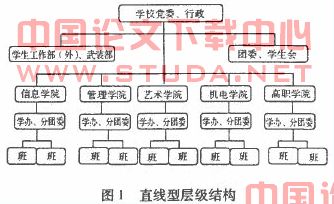 即校与院(系)两级管理、条块结合的运行机制。(如图1所示)其特点是:学校党委负责决策有关工作重大事项,学校行政具体指挥和执行党委的决策,具体由一位党委副书记或副校长分管负责;学生工作部(处)、团委是学生工作的职能部门,负责贯彻落实学校党委和行政的决策和部署,具体指导院(系)的学生工作;院(系)在学校党委和行政的领导下,在学生工作职能部门的指导协调下组织开展学生工作,一般由一位党总支副书记具体领导,由分团委、学生工作办公室等组成的院(系)学生工作部门具体开展学生工作。直线型层级结构的特征是高度集权,其优点是决策迅速,指挥灵活,决策层能够快速控制职能部门和院(系),整合校内资源,推进学校全局工作的开展。其缺点是:多层领导条块分割,职能交叉重叠,沟通协调难,如就业指导工作多由招生就业部门、学工部、教务处、院系等多个部门参与,横向协调性的工作量大,专业化的指导不够,容易造成“领导不负责、负责不领导”的工作局面;层级多信息不畅,学生工作的信息需经过学校党委、行政、学工部、团委、院(系)、辅导员、班级干部才能传递到普通学生,容易导致信息传递障碍和信息失真;组织跨度大,院(系)的工作重点主要集中在教学、科研上,学生工作往往游离于院(系)党政一把手领导之外,游离于中心工作之外;人事分离,学生工作部门在党委的领导下负责辅导员等学生干部的教育、考核、评价,但辅导员的用人权限却在院(系),产生了学生工作部门”管事不管人”、院系“管人不管事”的人事分离的现象。