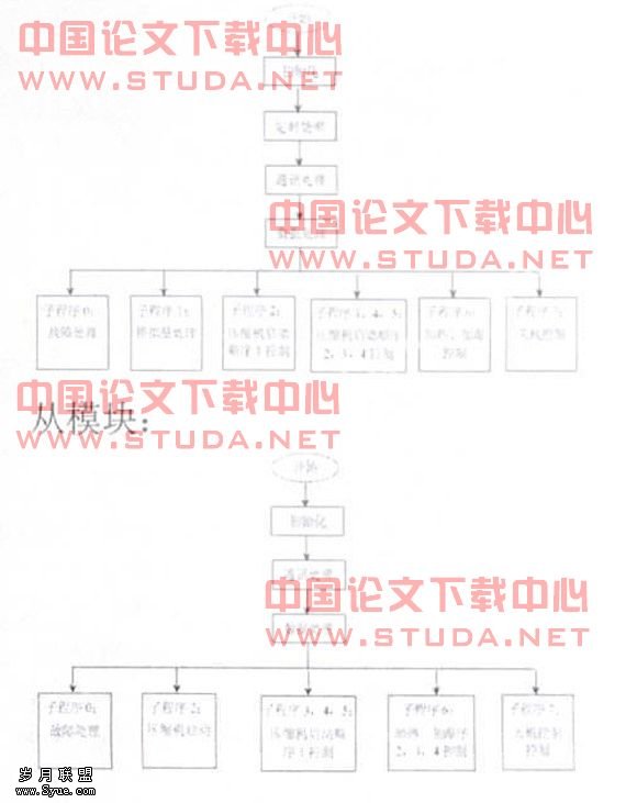 在从模块中,用网络写指令将压缩机运行时间写入主模块,在主模块中,根据每台压缩机运行时间,分别列出四种不同的压缩机启动顺序分别进入四个不同的控制子程序。