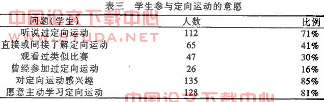 此次调查结果显示(表二),认为在高校广泛开展定向运动“有必要”和“很有必要”的教师为30名(占总数的100%),学生为149名(占总数的94%),说明广大师生对开展定向运动是普遍赞成的。另外,通过调查显示(表三),有135位学生对于开展这项新型的运动项目“很感兴趣”,占总数的85%,并有128名“愿意尝试并主动学习”,这项运动,占总数的81%,说明学生参与定向运动的意愿较高,乐意接受并学习此项运动课程。所以,广泛开展定向运动是可行的。