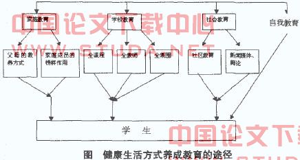 发挥班集体、宿舍的养成教育功能。班集体不仅是学生学习和生活的依托,而且是健康教育的场所。建设优秀班集体。是养成教育的有效途径。宿舍既是学生栖身的场所。又是多种思想交流、碰撞、冲突的场所。因此。一个班集体、一个宿舍的生活方式是否健康,对集体中每一个成员的健康生活方式形成的影响很大。调查表明:一个集体的同学如果都养成了喜欢运动、平时注重膳食营养、无抽烟和喝酒的好习惯,那么这个集体无形的鞭策和制约.必然会形成好的生活方式。因此,经常举行班级、宿舍之间的体育比赛,可激发学生参与运动的兴趣。发挥班集体和宿舍的养成教育功能。 发挥校园文化养成的功能。健康生活方式的养成是始于课堂、形成于课外、实践于社会的过程。因此,应不断加强养成教育的环境建设,把养成教育的内容辐射渗透到校园环境中去,让校园的每一个地方,都成为健康生活方式养成教育的环境,使学生时刻置身于无声的养成教育氛围之中,达到习惯养成的目的。例如:在食堂贴上“饮食合理,适量运动,保障健康”的标语;在馆贴上“生命在于运动”、“为了健康,请您常来”标语;在宿舍宣传栏贴上“吸烟有害健康”,“良好的睡眠促进健康”标语。在校园主干道贴上:“运动让你更加健康”、“活力的校园因运动而美丽”等标语。通过举办各种活动让学生感受到健康教育的存在,如:每学期举行以“参加长跑比赛,告别不良习惯”为主题的校园长跑比赛等活动。改革体育课.教师可以通过把游戏改编成体育游戏的方式,把学生从网络游戏中拉回到体育运动场来。在学生中举办“健康生活方式与体育锻炼的关系”的征文或辩论赛等。良好的校园氛围,可以促进学生健康生活方式的养成。