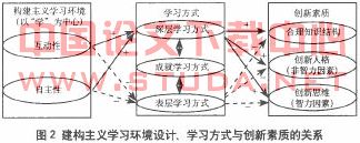 基于不同的学习动机,学习者会采用不同的学习方式。学习方式主要包括表层式、深层式和成就式三种。表层式是学习者基于外在动机,采用机械的死记硬背的方式进行的被动学习;深层方式,是学习者基于内在动机,为满足兴趣和有意义学习方式进行的主动学习;成就式是学习者基于成就动机,利用各种学习技能,为取得好成绩而学习。成就式方式与浅层式或深层式方式相结合,可形成“表层——成就式学习方式”或“深层——成就式学习方式”。不同国家针对不同层次的学生所做的许多研究表明,学习结果与学习方式是相关的。表层方式对于记忆无关联的细节是奏效的,但通常只能获得低分,常常会导致学生对学习结果的担心、焦虑。深层方式则会使学生认为学习任务是有趣的,通常能获得高分,而且有助于学生获得结构合理的学习结果。在建构主义教学模式的研究中,Biggs&Mooer、Dart和Tnag等国外学者经过实证研究,均得出结论:强调互动性与自主性的建构主义学习环境设计与深层学习方式正相关,而与表层学习方式负相关。传统的以“教”为中心的教学方式很容易导致大学生进行表层方式的学习,其获得的知识材料是零散的、孤立的、肤浅的,会造成新旧知识结构的脱节。而如果能够鼓励大学生进行深层次学习,则有助于他们构建合理的知识结构体系,促进大学生创新人格的形成,并激发其创新思维。大学生创新素质、学习方式与建构主义学习环境设计的关系如图2所示。