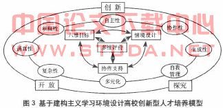 三、基于建构主义学习环境设计的高校创新型人才培养模型 在综合分析建构主义学习环境设计、学习方式和大学生创新素质关系的基础上,我们尝试建立基于建构主义学习环境设计的高校创新型人才培养的综合设计模型。如图3所示。