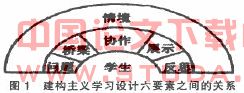 建构主义是认知心理学的一个分支,最早由瑞士心理学家皮亚杰(Piaget)于2o世纪6O年代提出,其闻汲取了维果斯基(Vy—gotsky)的文化心理学理论、奥斯贝尔fAusube1)的意义学习理论以及布鲁纳(Bruner)的发现学习理论等多种学习理论的精髓,它较好地揭示了人类学习过程的认知建构主义认为知识是学习者在一定的情境即社会文化背景下,借助其他人(包括教师和学习伙伴)的帮助,利用必要的学习资料,通过意义建构的方式而获得的。学习是在一定的情境即社会文化背景下.借助他人的帮助即通过人际问的协作活动而实现的意义建构过程m。Gaugon&Collay141等人曾对建构主义理论进行过较为系统的研究,出建构主义学习设计fcLD=ConstructivistLearningDesign)所包含的六大基本要素。即创设情境(DevelopingSituations)、提出问题(AskingQuestions)、搭建桥梁(Building Bridges)、组织协作(OrganizingGroupings)、展示成果(AranigngExhibits)和反思过程(InvitingReflections)等。图l给出了这六个要素之间的相互关系。