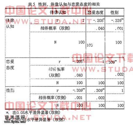 由表5可以看出,大学生的体像认知与恋爱态度存在显著的负相关,r=-0.205 。大学生对自己的体像认知水平越低其恋爱态度的得分越高,即越倾向于现实型恋爱。