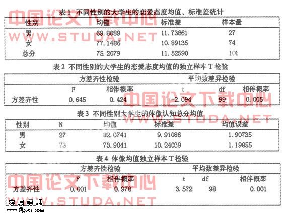 本研究采用“体像认知量表”和“恋爱态度量表”。体像认知量表由被试选择适合自己的选项,每周内是否存在及存在的症状出现的频率,按五级评分,得分越低表示对自己的体像认知评价越低。恋爱态度量表,被试就自己对恋爱的看法做出选择,量表按五级评分(坚决同意到坚决不同意),最后被试的总分,总分越高,越倾向于现实型恋爱。量表根据诺克斯和斯波拉科斯基的理论编制,他们把爱情的态度分为两种,一种是浪漫型,即把爱情看作是一种神秘的、永恒的力量,对爱情充满了激动、幻想和渴望,较少注重一些现实问题。另一种是现实性,以注重现实为特征,恋爱关系维系稳固、和谐。恋爱态度量表可用以测量一个人对恋爱的态度是现实型还是浪漫型。