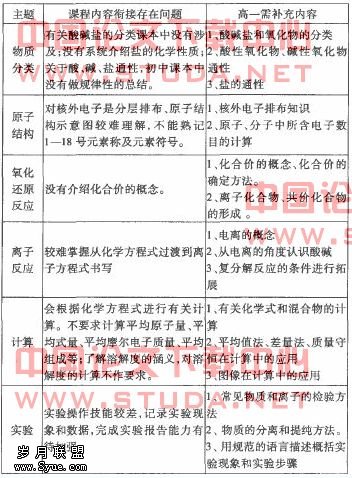 但是初高中课程在内容衔接上也存在一些问题:1、由于教材过于注重“三序结合”将难点分散编排,使教材内容缺乏系统整合,难以形成理论体系的整体观念;2、形象思维的训练不够;3、对能力的要求有些脱节,教材中示范性计算例题太少,但练习题中对计算方法、计算技巧要求较高。现在总结初高中课程在内容衔接上存在的问题及高一需要补充的内容,如表3所示。 形象比喻等方法,可以帮助记忆。