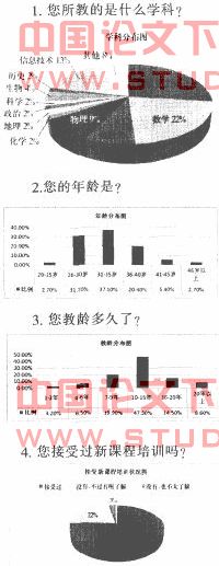 在积极探索参与式教育技术能力培训模式的基础上.我们对该培训模式的培训效果做了较广泛深入的调查研究。I3】我们以《中国中小学教师教育技术能力标准》为主要依据.自制了调查问卷。对在河南师范大学培训基地接受培训的部分结业学员进行了问卷调查此次调查回收的有效问卷为186份.被调查的对象由语文、数学、等十几学科的教师组成.年龄分布从20岁~46岁以上.教龄分布从1年~20年以上从样本分布来看.具有较广泛的代表性