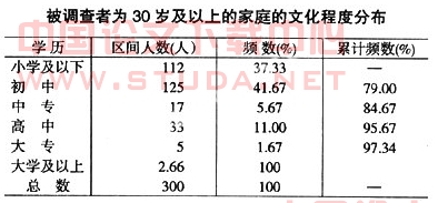 “孩子不想上学”这一答案的选择比率竟高达35%,甚至高于“家庭收入少”和“学费高”两个选项,可以说,这是完全出乎意料的。而通过我们继续对产生这一结果探究其原因,我们发现,家长的文化程度整体偏低,对子女应主动接受教育的意识不强应该是导致这一结果出现的直接原因,在接受调查的350个少数民族农村家庭中,户主为30岁及以上的被调查者共有300户,在这些家庭中,具有初中及初中以下学历的家长占到总数的近80%,有237户之多。具体详见下表: