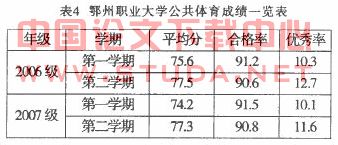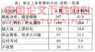 调查结果分析:表1显示目前大部分(64.3%学生对上体育课的目的和动机比较明确。但还有近四成(35.7%)的学生对体育课的认识存在偏差究其原因:(1)目前鄂州职业大学在公共体育课教学中.大一年级第一学期仍以班为单位进行分班教学,班级中学生的差距很悬殊,在教学中又采用相同的教学标准和考试要求,这样势必造成一些基础差的学生产生心理上对上体育课产生畏惧心理,继而对上体育课反感;(2)由于教学条件的限制。目前教学内容是按规定的统一进度安排教师在教学中为了完成教学任务,虽然能根据教材可选择一些趣味性较强的内容融入教学中,但仍然不能满足学生广泛的兴趣要求;(3)大学一年级第二学期虽然采用选项课教学,但自主选择受到教学内容和课时的限制(开学初分项和雨天也影响部分课时),学生刚刚对体育课有了一点兴趣.一学期就结束了,致使部分学生对体育课产生厌烦心理;(4)反映出教师对学生的学习目的、对体育课认识的教育力度不够。