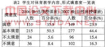 调查结果(表2)表明:(1)2006级学生的满意度明显好于2007级.这说明采取选项课教学更受学生欢迎;(2)有20%左右的学生对目前的教学内容和形式不太满意和不满意.这就表明我们目前体育课教学内容与形式仍需进行深入改革。在期中教学检查学生座谈中。很多学生认为在大学全面开设基础体育是不适宜的.应尽可能地提供多种教学内容和教学类型供学生选择。如果让学生进行自主选择教学内容和形式的话。多数学生表示会选择自己喜欢的项目.有教师指导的俱乐部教学形式最好。这说明大部分学生对体育课的内容和形式是有选择性的。