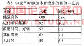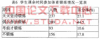 表6是学生课余时间参加锻炼的调查结果。结果显示:只有27.1%的学生能养成天天锻炼的良好习惯,偶尔参加锻炼的学生过多(44.5%),为了考试需要和不锻炼的学生居然达~Jt28.4%.超过经常锻炼的学生比率,这跟教育部提倡的“每天健身一小时,健康工作五十年,幸福生活一辈子”的终身体育教育目标有很大的差距.这一问题应引起重视。